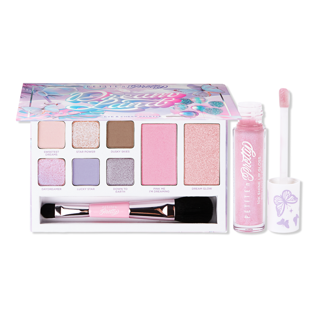 Petite n Pretty's Dream Land Makeup Starter Set includes starlit shimmery shadows, a blush & highlighter to create an extra dreamy glow that twinkles brighter than the stars. A swipe of 10K Shine Lip Gloss in Pink Cloud will turn your dreamland into a sparkling reality!